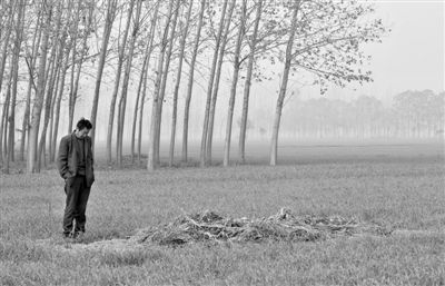 11月21日,高松中站在脑瘫双胞胎儿子坟前。尸检时坟被刨开,复埋时,高松中捡起地头秸秆堆在坟头,这才看起来是座坟。