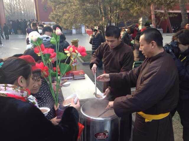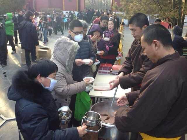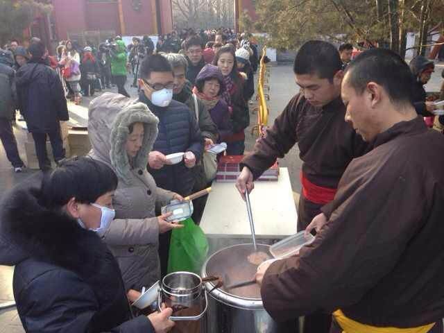 新京报讯(记者 李雪莹 摄影 薛珺 ) 今天是农历腊八,雍和宫一早开门免费舍粥。尽管今天不是周末,天气降温,仍有超过4000民众赶来“喝粥求福”。最早排队等施粥的宁姓小伙,早上四点已经赶到雍和宫门口。雍和宫相关负责人称,舍粥从9点开始,到10点半停止,共施粥99锅,超过了去年的93锅。