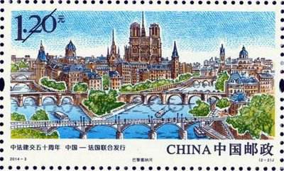 新京报讯 (记者 高美)中法两国邮局定于1月27日,即中法建交50周年纪念日当天,联合发行一套纪念邮票。邮票以河流为主题,分别选取了南京秦淮河和巴黎塞纳河的标志性景观。这也是继1998年两国联合发行《故宫与卢浮宫》邮票后,再次联合发行邮票。纪念邮票将在中国发行1000万套,法国发行150万套。