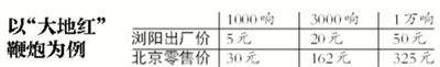 1500多公里之外的湖南浏阳,被称为中国烟花爆竹之乡。记者从当地一家生产厂商处了解到,一千响的“大地红”鞭炮出厂价仅需5元钱,三千响的不到20元,一万响的约50元。