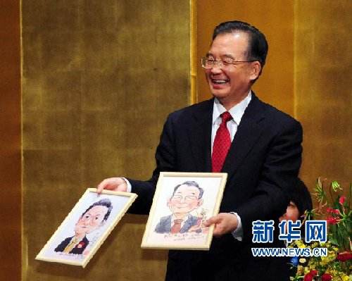 温家宝在湖南长沙就经济发展情况调查研究,在参观一家软件开发公司时,该公司员工送上一幅即兴创作的描绘温家宝的漫画,“温家宝愉快地接受”。