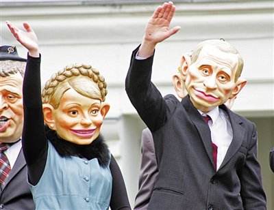 乌克兰,人们戴着普京和季莫申科面具推广当地旅游。