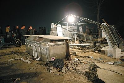 昨晚,平度市杜家疃村,被烧毁的帐篷边摆着冰柜,用来保存村民耿福林的遗体。昨日凌晨,抵抗拆迁的帐篷突然起火,帐篷内四人一死三伤。新京报记者 王嘉宁 摄