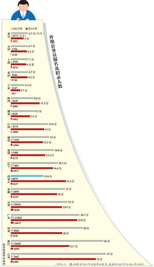 自2003年大学扩招后首批毕业生“就业年”开始,各地“公考”持续升温,每年都会创下当年的报名人数最高值,如江苏,2011年为275024人,2012年为317263人,2013年为371171人。但今年,多地报名人数开始下降。