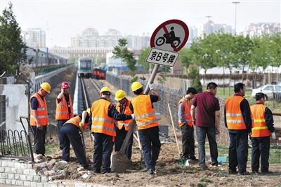 下午4时,脱轨的地铁列车被拖回到马家堡车辆段内,工人正恢复被破坏现场。