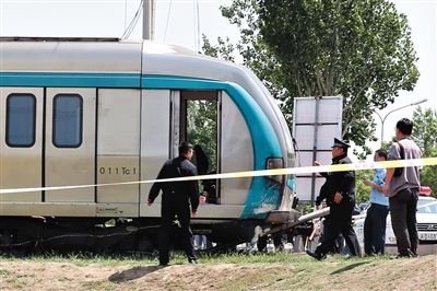 南四环中路与草桥东路交叉口东北角,冲出铁轨的两节车厢和南四环辅路垂直,两名警察在车头查看。