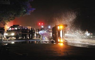 昨日凌晨1点多,昌平太平庄东路与太平庄中二街交叉路口,被掀翻的车辆汽油泄漏,消防员正用泡沫处理。新京报记者 尹亚飞 摄