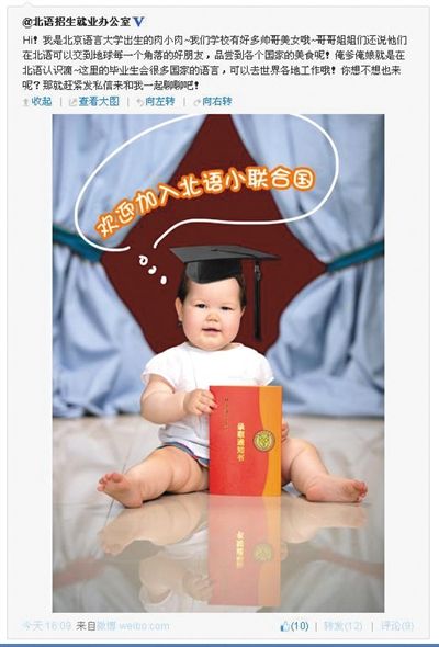 新京报讯(记者黄颖)“欢迎加入北语小联合国”,昨日,北京语言大学招生形象代言人“肉小肉”,手持该校录取通知书,在北语招生就业办公室和教育部的官方微博亮相。记者了解到,中美混血宝宝“肉小肉”仅11个月大,系北语外教之女。
