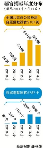自2010年起,原国家卫生部和中国红十字会联手探索建立公民身后自愿捐献器官体系;2013年结束3年试点,在全国铺开。全国政协常委、中国人体器官捐献与移植委员会主任委员黄洁夫介绍,截至今年8月14日,全国共完成公民身后自愿捐献器官2107例,获取捐献器官5787个,通过移植手术,挽救了5000多位患者的生命。