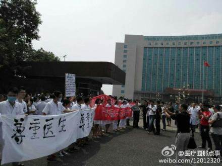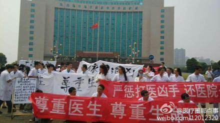 现场图片显示,医护人员们身着白大褂,手举“尊重医生、尊重生命”、“严惩打医凶手”的横幅,一名参加该活动的医护人员说,大家是希望领导有个交代,保障我们的人身安全,“我们现在上班提心吊胆,没有一点安全感”。