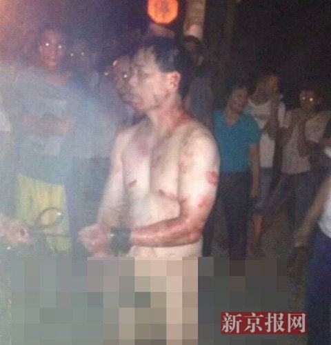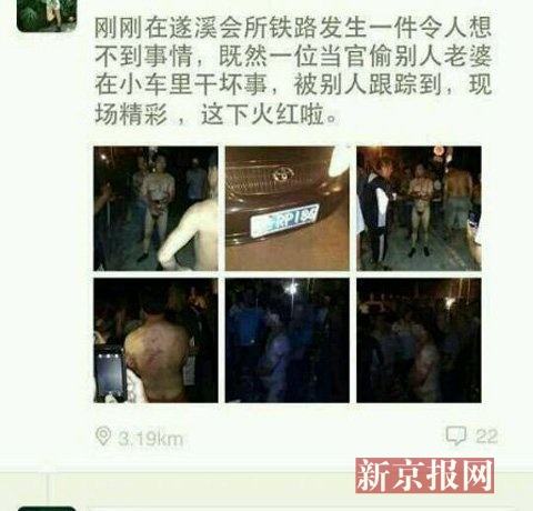 网帖中还贴出多张照片,照片上一中年男子全身赤裸,身上有多处看似被殴打的紫色伤痕,并有多处血迹,旁边站满了围观的群众。爆料帖中称“车震”事件的男女都有家庭:“男方为杨柑交警局局长”。