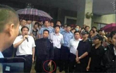 在多家媒体官微发布的现场图片中,一身着白色衬衣疑似领导模样的男子,手持话筒在人群中讲话。其左侧一身着警察制服的男子一手为其撑伞,一手握着状似手枪的东西。