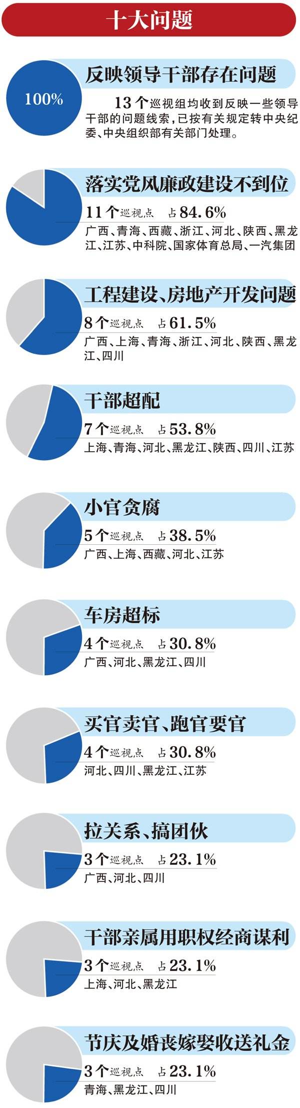 这份“巡视清单”揭示出的腐败问题、作风问题林林总总,其中,既有长期存在的老大难问题,也有一些新的苗头;既有一些共性问题,也有存在于个别地方和单位的突出问题;既有中央反复强调明令禁止的问题,也有首次明确提出来的问题。据新华社
