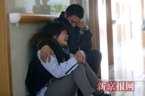 11月7日,北京朝阳急救中心急诊ICU病房外,京京妈妈蒋女士和丈夫坐在医院走廊,蒋女士泣不成声,一直说“我对不起孩子”。新京报记者 王贵彬 摄