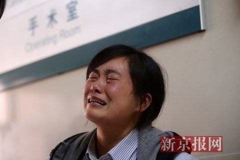 11月7日,北京朝阳急救中心急诊ICU病房外,京京妈妈蒋女士泣不成声。新京报记者 王贵彬 摄