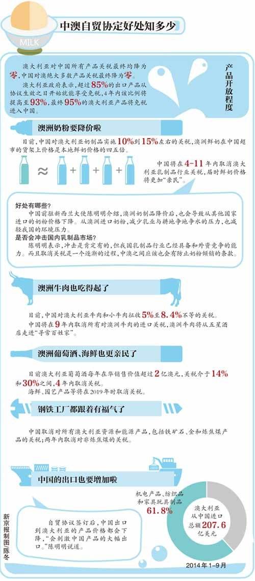 同时,中澳自贸协定一旦签订,对国人的生活会有直接的影响,如宝宝们能喝上物美价廉的澳洲奶粉了、工薪阶层品尝高大上的澳洲牛排时不必担心钱包了、土豪投资澳洲时不必再苦恼审查了……