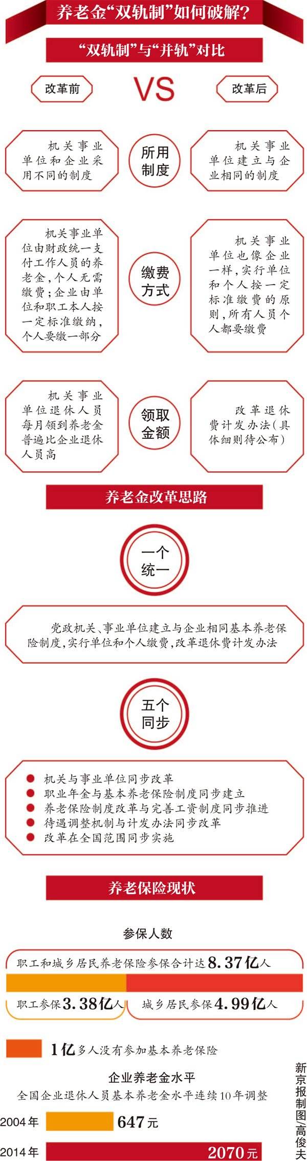 众所期盼中,酝酿了7年的养老金“双轨制”改革终于破局。23日,国务院副总理马凯向全国人大常委会作关于统筹推进城乡社会保障体系建设工作情况的报告时透露,机关事业单位与城镇职工统一的养老保险制度改革方案已获通过,这也意味着养老金双轨制将进行改革。多名专家对新京报记者表示,养老金双轨制改革方案会在明年公布,方案将涉及一系列细节问题,如国家财政如何支撑、“补齐欠账”即如何补齐公务员此前“欠缴”的养老金账户、机关事业单位养老标准怎样跟企业对接等。
