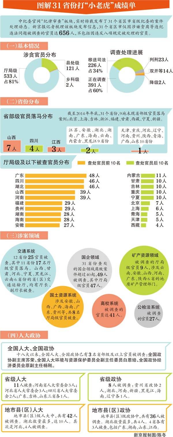 前日,中纪委“晒”出了年度反腐成绩单。十八大以来至2014年底,已结案处理或正在立案审查的中管干部99人。与中纪委打“大老虎”的力度相比,31个省份打“小老虎”的成绩单同样出色。初步统计,自十八大以来至2014年底,31个省份立案调查的厅局级及以下官员达656人。