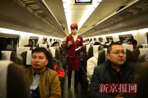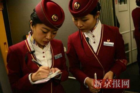 燕郊站到北京站首班动车,乘务员交流。新京报记者 王嘉宁 摄