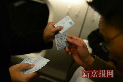 车厢内,一乘客展示其买的5天往返燕郊北京的10张动车票。新京报记者 王嘉宁 摄