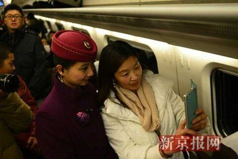 乘客和乘务员合影。新京报记者 王嘉宁 摄