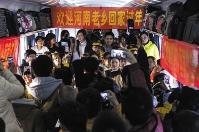 车厢内乘客与工作人员合影。昨日上午7时许,北京铁路局2015年春运首趟务工人员专列从北京西站发车,1142名务工人员返乡。新京报记者 周岗峰 摄