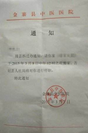“接县拆迁办通知,请你家于2015年3月8日中午12时之前搬家,否则县人社局将对你进行停职。”这份“通知”下发给该院一职工。