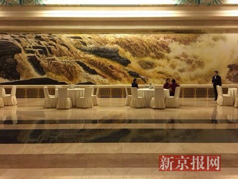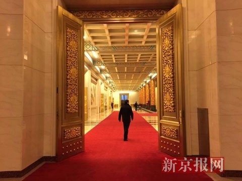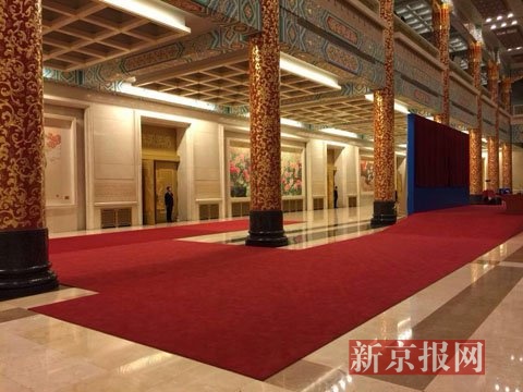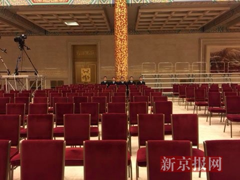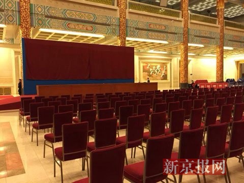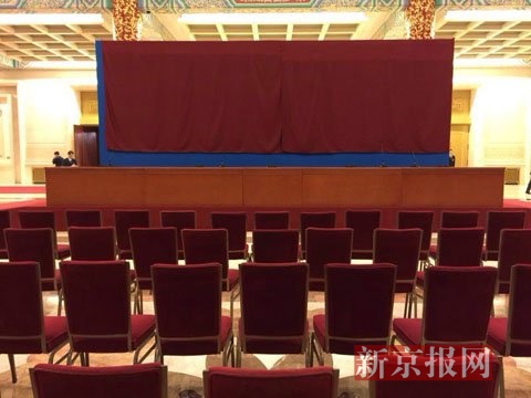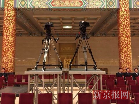 已经布置妥当的总理记者会现场。 新京报首席记者 陈杰 摄