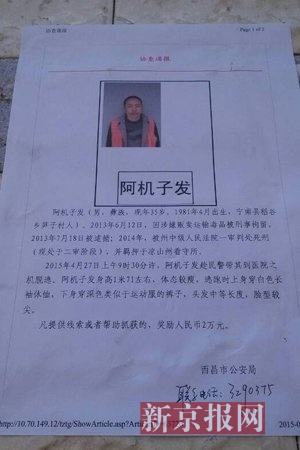 事发后,西昌市公安局贴出一则“协查通报”,逃犯名叫阿机子发,男,彝族,现年35岁,1981年4月出生,宁南县稻谷乡笋子村人。2013年6月12日,因涉嫌贩卖运输毒品被刑事拘留,2013年7月18日被逮捕;2014年,被州中级人民法院一审判处死刑(现处于二审阶段),并羁押于凉山州看守所。