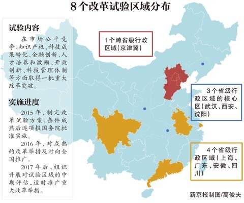 新京报讯 (记者沙璐)中办、国办印发的《关于在部分区域系统推进全面创新改革试验的总体方案》昨日发布。按照方案,京津冀、上海、广东、安徽、四川、武汉、西安、沈阳成为改革试验区域,担负起先行先试的重任。