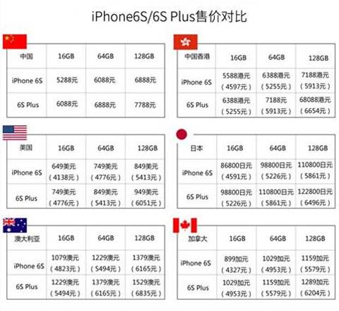 上图列明了iPhone 6s及6s Plus在中国内地、中国香港、美国、日本、澳大利亚以及加拿大的首发售价,不难看出,其中中国内地售价最高,美国最低。