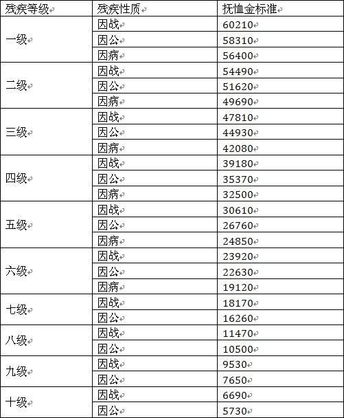 调整后,一级因战、因公、因病残疾军人抚恤金标准为每人每年60210元、58310元、56400元,分别比2014年提高了7850元、7610元、7360元。