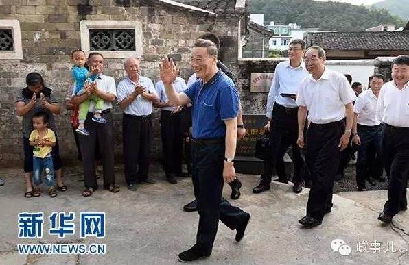 王岐山在红四军革命旧址参观时,向附近村民挥手致意。