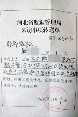 河北省监狱管理局出具的来访事项转送单。熊先生供图