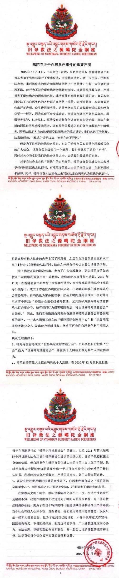 噶陀寺决定,“撤销白玛奥色‘香港世界噶陀法脉分会’常务副理事职务,一并永久撤销其成立的‘世界噶陀法脉香港分会’、‘噶陀国际金刚乘中心’。发出此声明时日起,坚决不再允许白玛奥色利用噶陀之名。”