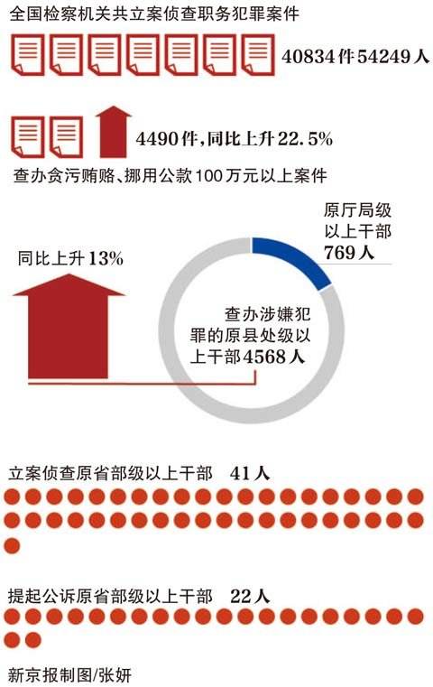 昨天上午,最高人民检察院检察长曹建明向全国人大作工作报告。报告显示,去年检察机关共对41名原省部级以上干部立案侦查,对22名原省部级以上干部提起公诉。