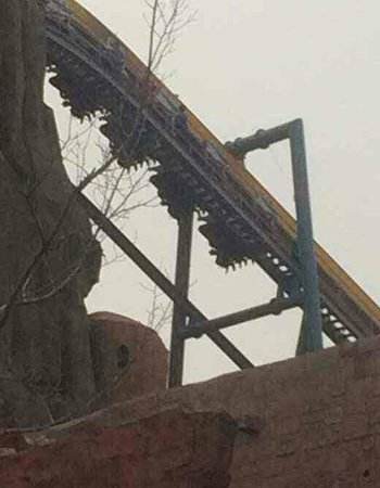 目击者称,大概下午3点半左右,过山车突然停住,游客身体朝下停在空中。网络图片显示,多名游客坐在过山车中,整个翻转朝下,停在轨道中间的高点半空。