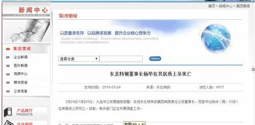 新京报快讯(记者侯润芳 实习生王春晓)昨日,东北特殊钢铁股份有限公司在其官方网页上发布消息,称东北特殊钢铁集团有限公司董事长、党委书记杨华在其居所上吊身亡。
