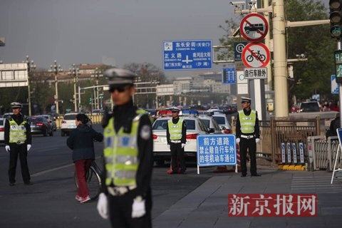 北京加强电动自行车管理措施今天(4月11日)实施,根据措施,包括长安街在内的10条大街禁止电动自行车上路。记者在长安街沿线相邻路口看到,每个路口都有民警和协管员把守在非机动车道前端,防止不知情的电动自行车驾驶员拐入长安街。