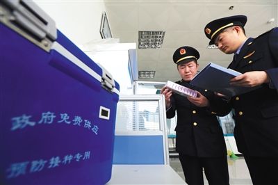 2016年3月23日,安徽省淮北市相山区桓谭市场监督管理所执法人员在社区卫生服务站对二类疫苗的储存、批次等环节进行检查。 图/视觉中国
