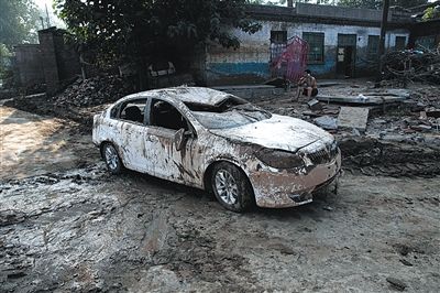 昨日,井陉山洪灾后状况。南关村受灾较为严重,当天路边停放的车辆被洪水淹没。新京报记者 贺顿 摄