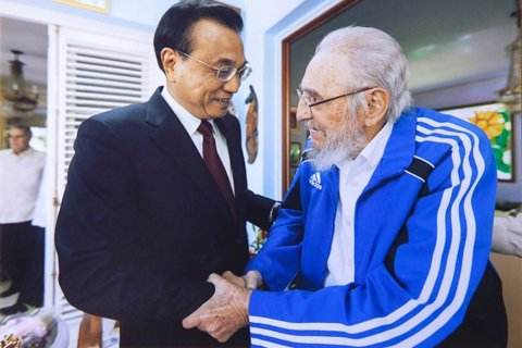 在卡斯特罗位于哈瓦那的家中,李克强与菲德尔·卡斯特罗交流用时近两小时。