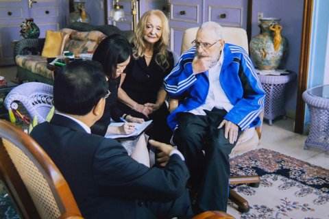 卡斯特罗身后的地面上,立着一个陶瓷制的中国寿星摆件。李克强首先向菲德尔·卡斯特罗转达习近平主席、中国领导人和中国人民对他的亲切问候和良好祝愿,并祝贺他九十岁寿辰。