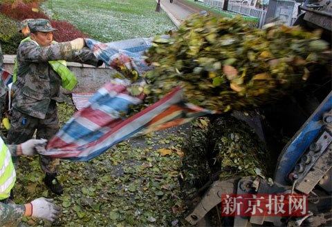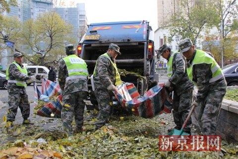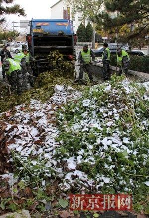 新京报快讯 2016年11月21日下午四点,石景山路古城路口,环卫作业车辆正在清运落叶。 据石景山区环卫中心介绍,由于一夜雨雪加大风天气,落叶量突增,保洁员的小三轮车一天从往返一两次增长到往返十余次,为节省时间和人力,环卫中心在落叶比较集中的主要干道周边指定落叶临时存放点,仅7公里长的长安街延长线石景山路上就设置了五个临时存放点,再由道路清扫应急突击队集中装车清运到垃圾转运站,副队长刘泽兵介绍,当天,他们清运的落叶预计在35吨左右。新京报记者 浦峰 通讯员 王祝炫摄影报道