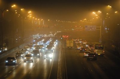 昨日夜间,广渠门内大街,能见度差。 新京报记者 彭子洋 摄