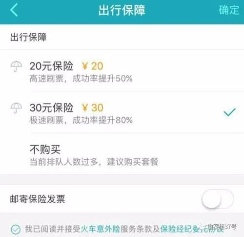 ▲一款订票软件在预约抢票时,会自动勾选保险,保险费用越高,抢票成功率越大。 网络截图
