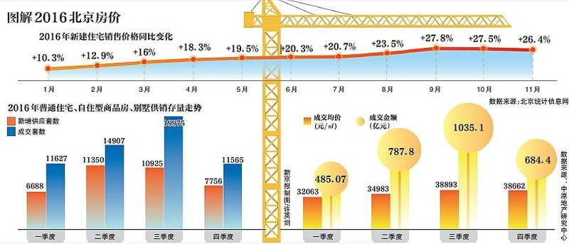 “2017年的市场环境已呈现出大环境趋紧、小环境更严的态势,总体判断只会比去年更严,去年政策效果还将持续释放。”中原地产首席分析师张大伟表示,“9·30新政”实施一季度,效果已显现,房价上涨态势得到遏制,据统计,2016年12月,北京市新建商品住房成交均价回调到每平方米3.82万元的水平,成交量下降10%左右。