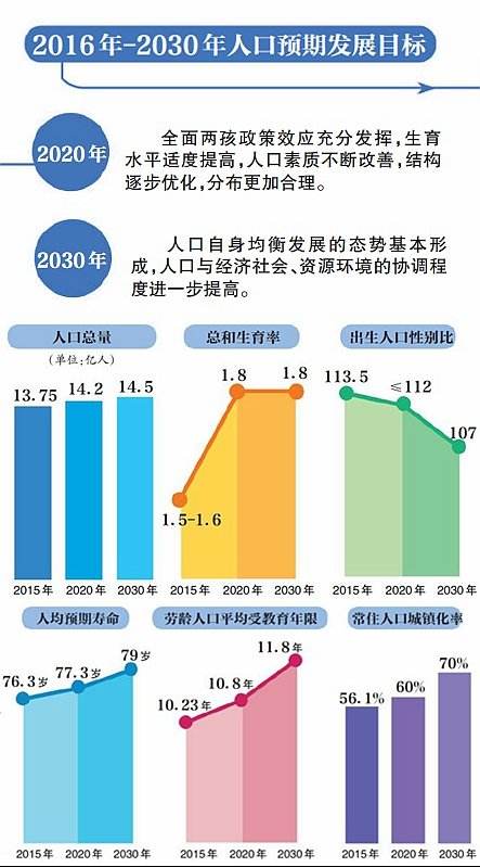 《规划》提出,总和生育率逐步提升并稳定在适度水平,2020年全国总人口达到14.2亿人左右,2030年达到14.5亿人左右。