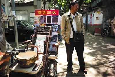 4月26日,一名古玩商人站在胡同口等待生意上门。