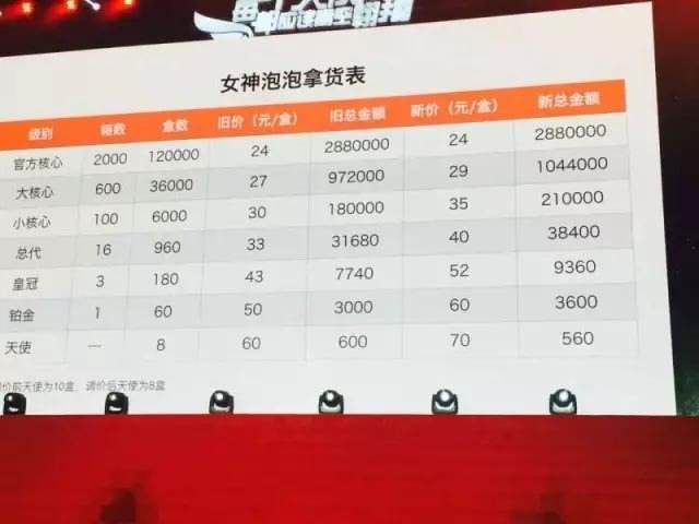 符女士获得的一张"微商各级代理提货标准"显示,公司给代理明确了7个层级的提货标准,从高至低依次为官方核心、大核心、小核心、总代、皇冠、铂金和天使级别。级别不同,相同产品的进价不同。以棒女郎为例,根据2016年8月涨价后的标准,要成为"官方"级别的代理,需交600万,每盒仅30元;入门级别"天使",需交640元,每盒80元。